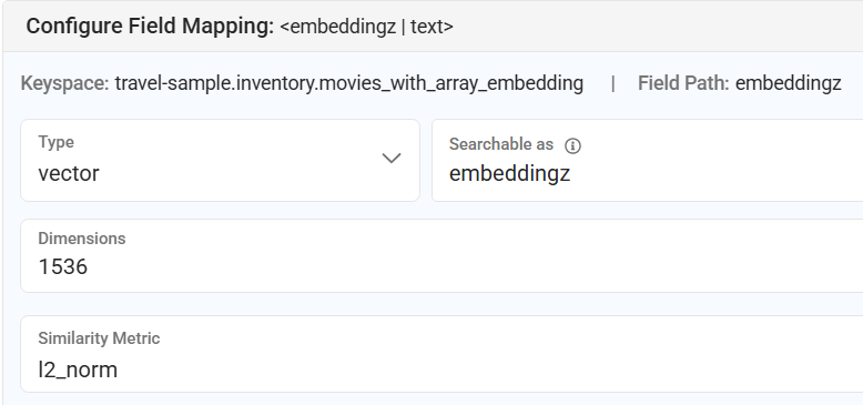 The sample dataset’s embeddings were generated using Open AI’s text-embedding-ada-002 model. A vector search index was created with the following settings